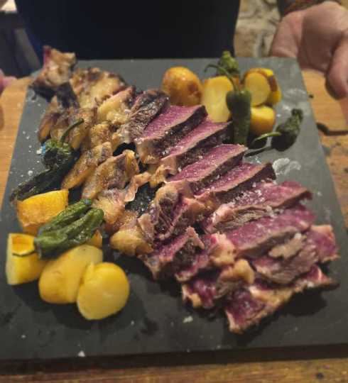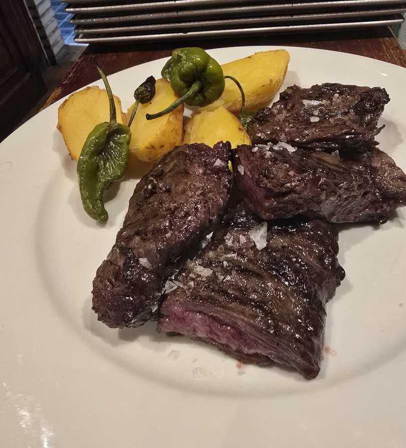 Uno de nuestros cortes más demandados y populares es el tradicional chuletón de Rubia Gallega, con una maduración seca entre 25 y 35 días. Su costra, crujiente y con un aspecto delicioso, se sirve con guarnición de patatas asadas y pimientitos verdes y lo convierte en pieza ideal para compartir.